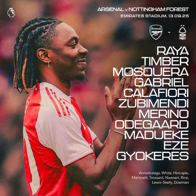 Sau 14 năm, Eberechi Eze trở lại khoác áo Arsenal và ra sân đá chính khi Pháo thủ tiếp đón Nottingham.