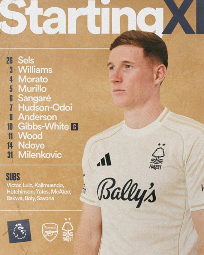 - Nottingham (4-2-3-1): Sels; Aina, Milenkovic, Murillo, Williams; Sangare, Anderson; Ndoye, Gibbs-White, Hudson-Odoi; Wood.