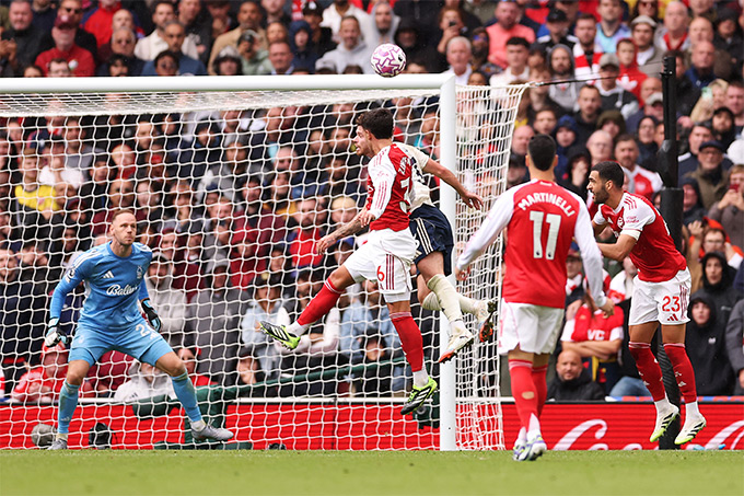 Sau cú đá phạt góc chính xác của Madueke, trung vệ Gabriel đã có pha băng vào rất nhanh để đánh đầu nhưng bóng lại đi chệch cột dọc.