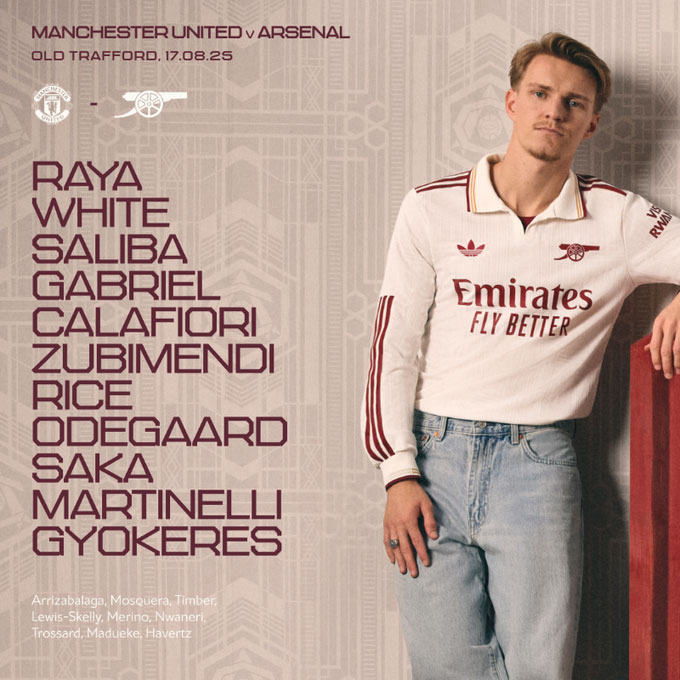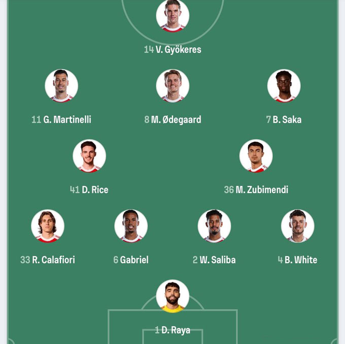 Trong khi đó bên phía Arsenal, HLV Arteta vẫn dùng sơ đồ quen thuộc 4-3-3. Thủ thành David Raya trong khung gỗ với bộ tứ vệ Calafiori, Gabriel, Saliba và Ben White án ngữ phía trên. Tân binh Zubimendi hợp cùng đội trưởng Odegaard và Declan Rice thành bộ ba tiền vệ. Trên hàng công, Martinelli và Saka hỗ trợ cho trung phong cắm Gyokeres.