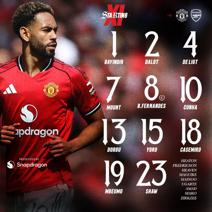 Trong khi đó bên phía chủ nhà MU, HLV Ruben Amorim cũng tung vào sân ngay từ đầu 2 tân binh là Matheus Cunha và Bryan Mbeumo. Tuy nhiên, một tân binh khác là Benjamin Sesko lại phải ngồi dự bị.