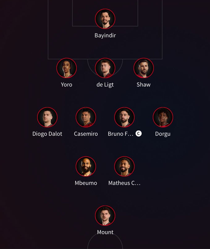 Với những cái tên trong đội hình xuất phát được công bố, nhiều khả năng HLV Amorim vẫn sẽ sử dụng sơ đồ 3-4-2-1 với Bayindir trong khung gỗ. Bộ ba trung vệ là Yoro, De Ligt và Shaw. Cặp wing-back là Dalot và Dorgu. Đội trưởng Bruno Fernandes đá cặp cùng Casemiro ở giữa sân. Ở phía trên, hai tân binh Cunha và Mbeumo đá hai số 10 còn Mason Mount đá số 9 ảo.