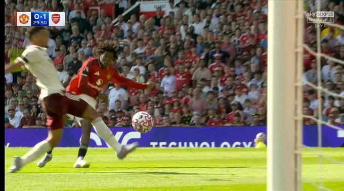 Nhận đường chuyền của đồng đội và ở tư thế trống trải bên cánh trái, Dorgu xộc thẳng về phía khung thành của Arsenal trước khi tung ra cú dứt điểm cực mạnh. Đáng tiếc là bóng đi chạm cột dọc. MU đang tiến rất gần tới việc có bàn thắng.