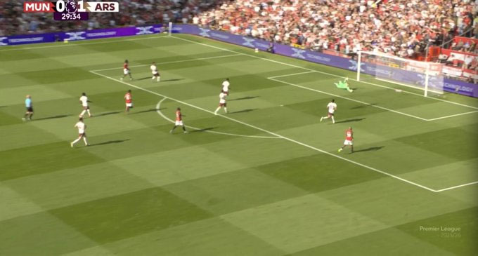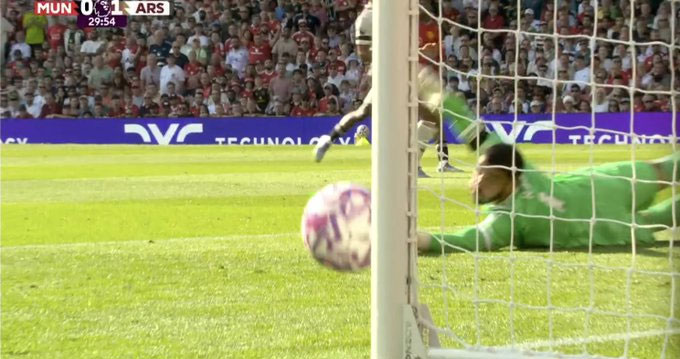 Amad Diallo đi bóng rồi tung ra cú cứa lòng bằng chân trái nhưng bóng đi quá nhẹ và không làm khó được Raya. Các cầu thủ tấn công của MU cần phải dứt điểm khó và chuẩn xác hơn mới mong đánh bại được thủ môn của Arsenal.