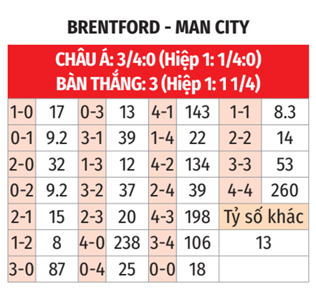 - Brentford thắng hiệp 1 theo châu Á: Brentford thắng theo châu Á ở 3/4 trận sân nhà gần đây. Về phần Man City, đội bóng này thua hiệp 1 theo châu Á ở 5/6 trận gặp Brentford gần nhất.