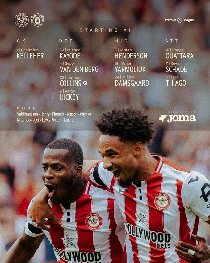 - Brentford (5-3-2): Kelleher; Kayode, Berg, Collins, Pinnock, Lewis-Potter; Yarmoliuk, Henderson, Damsgaard; Thiago, Schade.