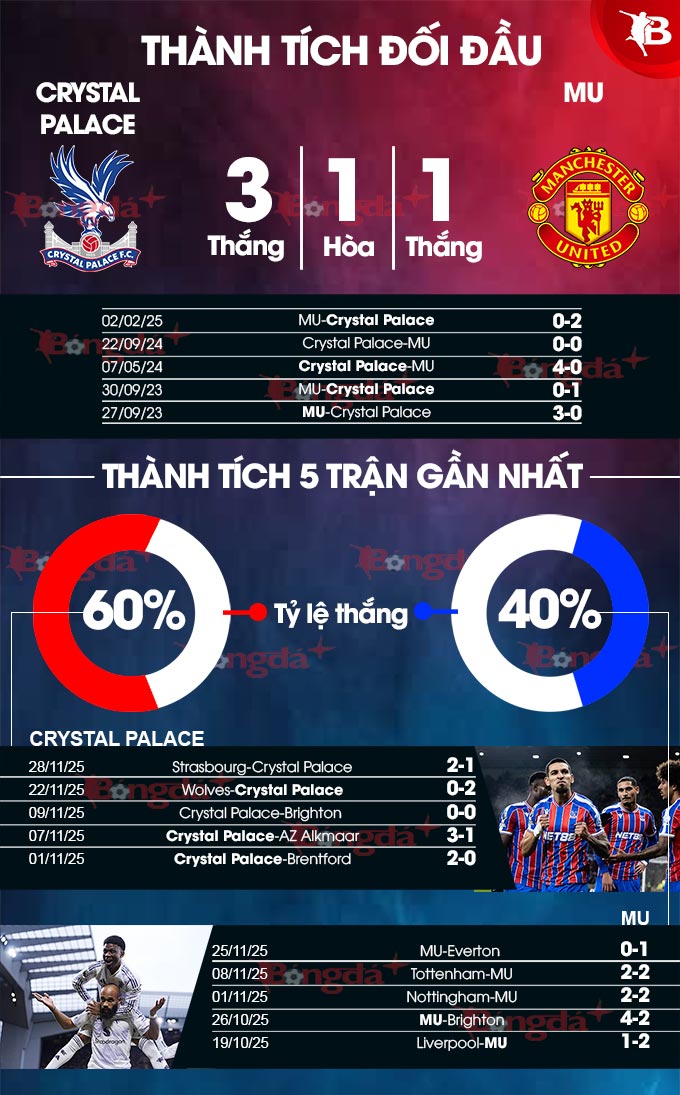 Cả hai đội cùng vừa chịu thất bại ở trận đấu gần nhất. MU lại gặp khó khăn hơn khi phải thi đấu tại Selhurst Park, nơi Crystal Palace đang chiếm ưu thế với chuỗi 4 trận bất bại. Song, khi bị rơi vào thế chân tường, đội bóng của HLV Amorim có thể bật lại để giành chiến thắng.