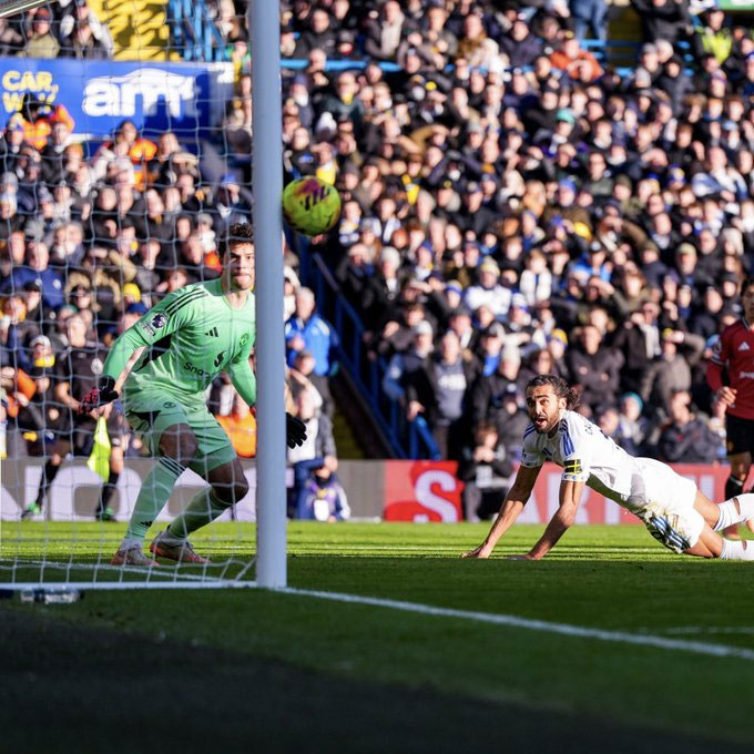 VÀOOO!!! Sai lầm từ đường chuyền của Dalot đã tạo điều kiện cho Leeds phản công nhanh. Aaronson dùng tốc độ loại bỏ Heavan và thực hiện cú dứt điểm chéo góc đánh bại Lammens.