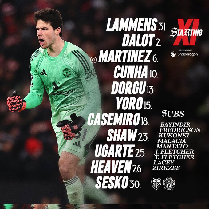 MU: Lammens, Dalot, Yoro, Martinez, Heaven, Shaw, Dorgu, Casemiro, Ugarte, Cunha, Sesko