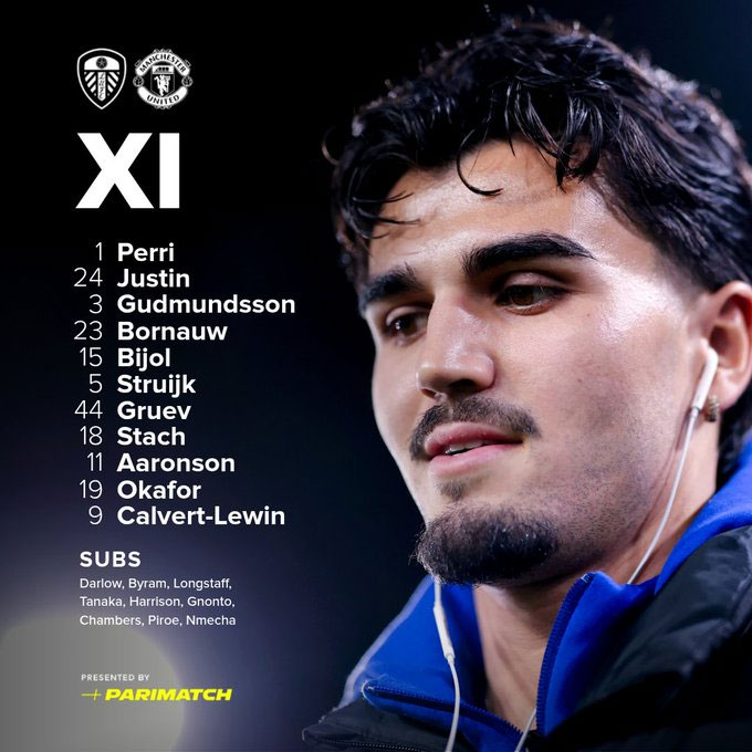 Leeds: Perri, Justin, Gudmundsson, Bornauw, Bijol, Struijk, Gruev, Stach, Aaronson, Okafor, Calvert-Lewin