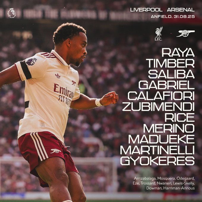 Arsenal: Raya, Timber, Saliba, Gabriel, Calafiori, Merino, Zubimendi, Rice, Madueke, Gyokeres, Martinelli