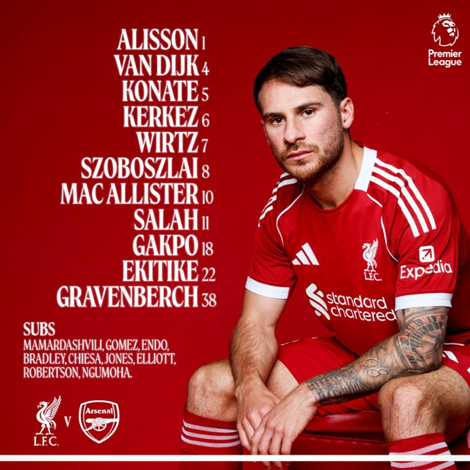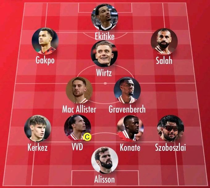 Liverpool: Alisson, Szoboszlai, Konate, Van Dijk, Kerkez, Mac Allister, Gravenberch, Salah, Wirtz, Gakpo, Ekitike