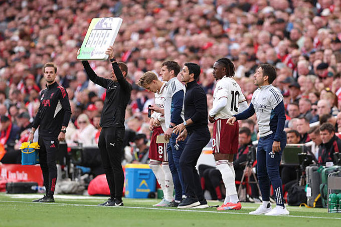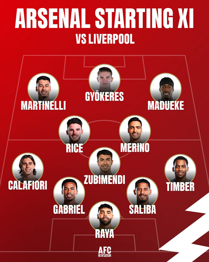 Trong khi đó bên phía Arsenal, HLV Mikel Arteta đã sử dụng tân binh Madueke ngay từ đầu bên hành lang cánh phải thay cho Saka chấn thương. Gyokeres đá cắm còn Martinelli đá cánh trái.