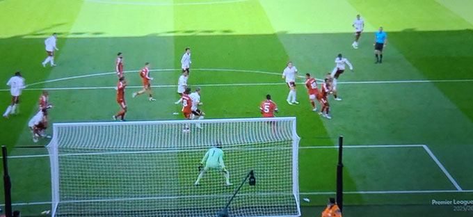 Wirtz tung ra cú dứt điểm khiến Raya không thể bắt dính. Sau đó, bóng lập bập và Ekitike đã đưa được bóng vào lưới. Tuy nhiên, trọng tài đã căng cờ báo việt vị với Gakpo.