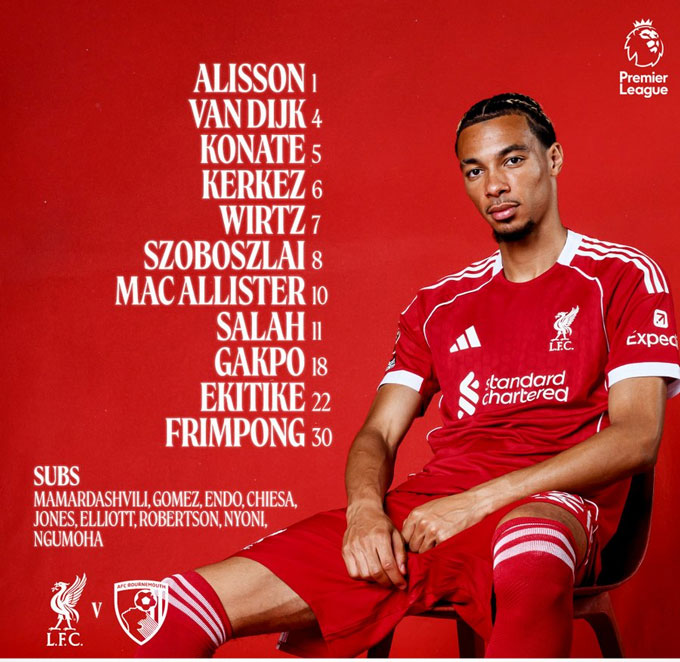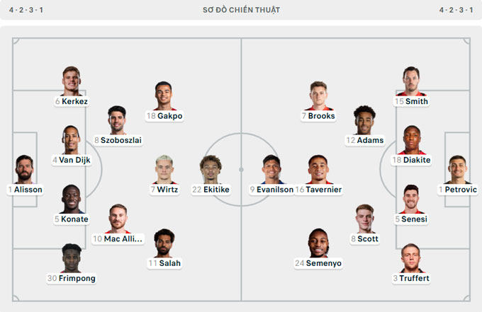 Tiếp đón Bournemouth ở trận khai mạc Ngoại hạng Anh 2025/26, nhà ĐKVĐ Liverpool ra sân với hệ thống 4-2-3-1, trong đó, tân binh Ekitike là người đá cao nhất trên hàng công. Hỗ trợ cho ngôi sao người Pháp là bộ ba Gakpo, Wirtz, Salah. Cặp tiền vệ trung tâm của Liverpool là Szoboszlai - Mac Allister, còn 4 hậu vệ gồm Kerkez, Van Dijk, Konate và Frimpong. Trấn giữ trong khung gỗ như thường lệ là Alisson.