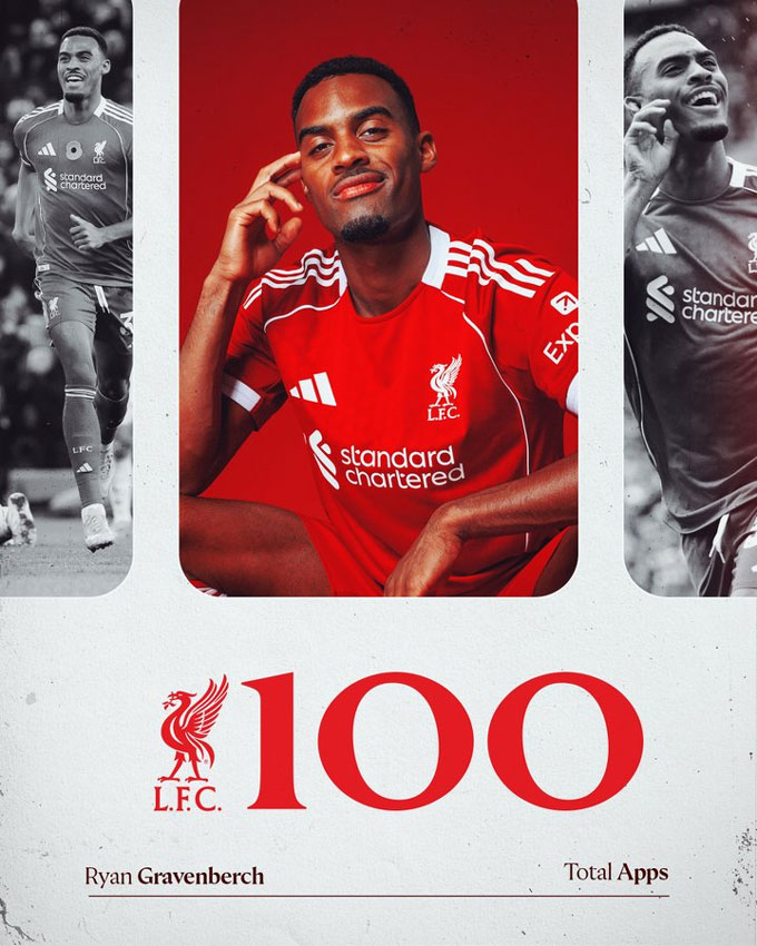 Tiền vệ Ryan Gravenberch sẽ có lần ra sân thứ 100 cho Liverpool trên mọi đấu trường.