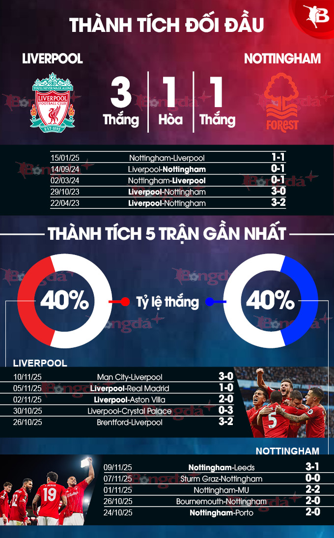 - Hiệp 1 không quá 1 bàn: 6/7 cuộc đối đầu gần nhất giữa hai đội đều khép lại với không quá 1 bàn thắng trong hiệp 1. Thậm chí 5 trong số 7 trận đối đầu nói trên còn không có nổi bàn thắng nào trong 45 phút thi đấu đầu tiên. Kịch bản tương tự cũng xảy ra ở 8/12 trận gần đây của Liverpool và 4/6 trận gần đây của Nottingham. Ngoài ra, 4/5 trận sân nhà gần đây của Liverpool cũng khép lại với không quá 1 bàn trong hiệp 1.