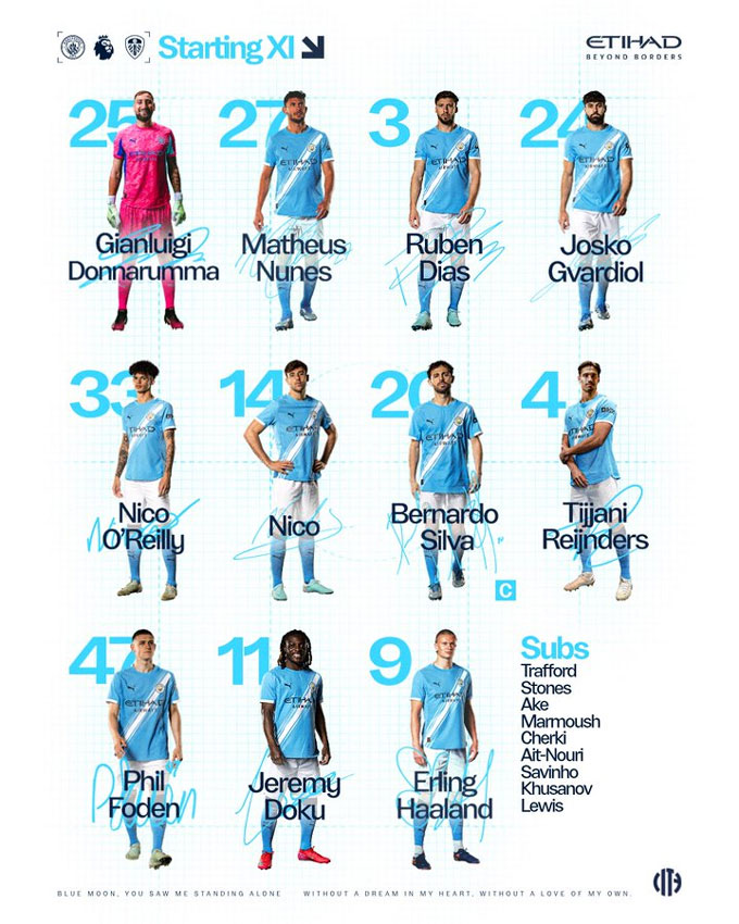 Man City: Donnarumma, Nunes, Dias, Gvardiol, O'Reilly, Gonzalez, Bernardo Silva, Reijnders, Foden, Doku, Haaland