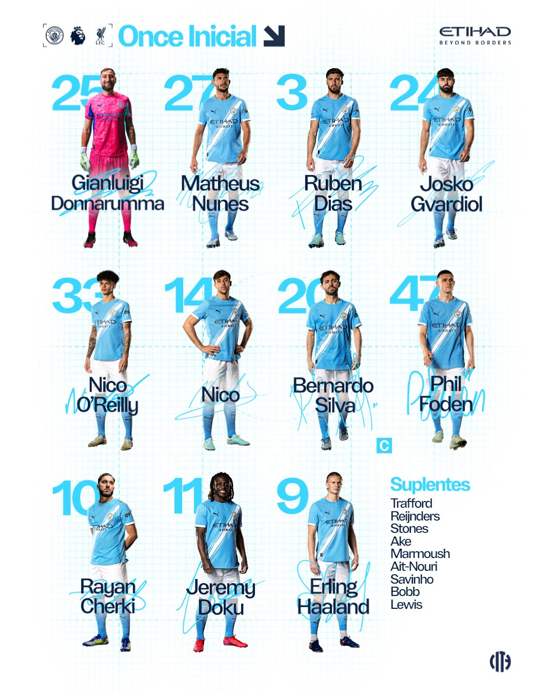 Lần đầu tiên trong mùa giải này, HLV Guardiola có một đội hình hoàn toàn khỏe mạnh. Gianluigi Donnarumma đã mắc sai lầm trong trận gặp Bournemouth và sẽ rất muốn chuộc lỗi khi đối đầu Liverpool. Matheus Nunes đã khẳng định năng lực ở vị trí hậu vệ phải và sẽ khả năng cao sẽ cùng với O'Reilly trấn giữ hai hành lang.
