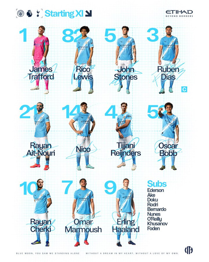 Man City: Trafford, Lewis, Stones, Dias, Ait-Nouri, Nico, Reijnders, Bobb, Cherki, Marmoush, Haaland.
