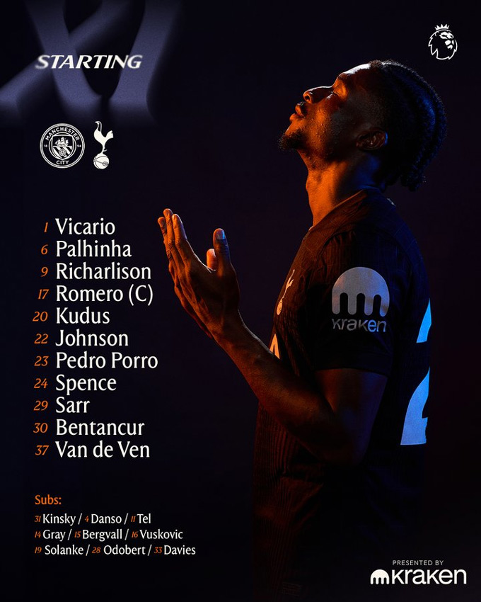 Tottenham: Vicario, Sarr, Romero, Van De Ven, Porro, Bentancur, Palhinha, Spence, Johnson, Kudus, Richarlison.