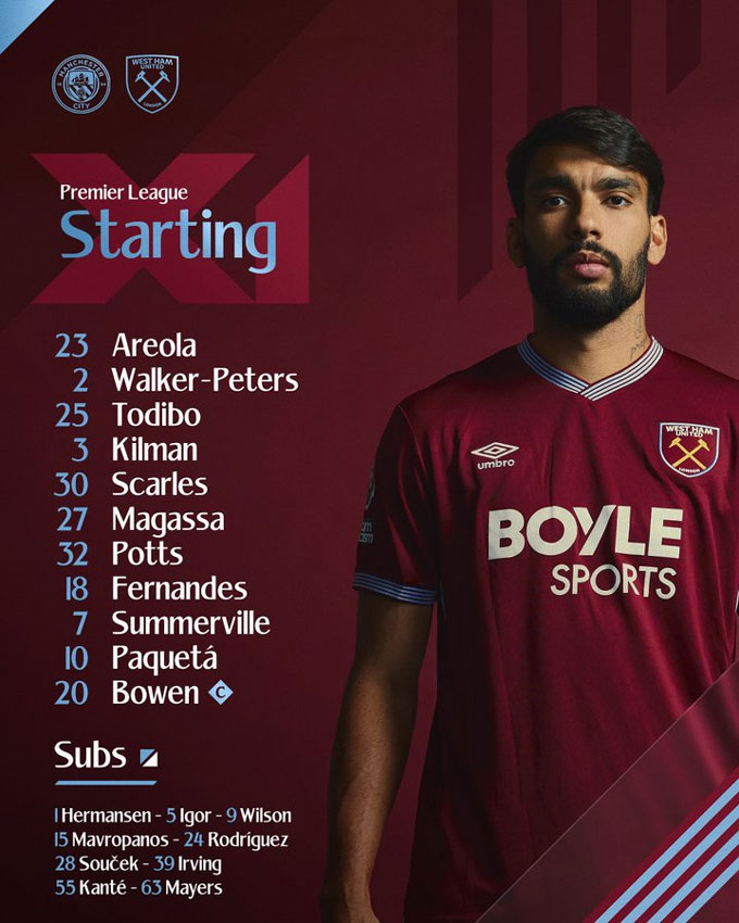 West Ham: Areola, Walker-Peters, Todibo, Kilman, Scarles, Mateus Fernandes, Magassa, Potts, Summerville, Paqueta, Bowen