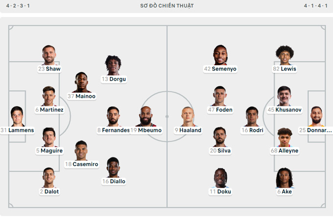 Về phía đội khách Man City, HLV Guardiola sử dụng hệ thống 4-1-4-1 khá quen thuộc, với Haaland đá trung phong. Bộ tứ giăng ngang đá ngay bên dưới gồm Doku, Silva, Foden, Semenyo. Rodri là người đảm nhận vai trò mỏ neo, còn hàng thủ có sự hiện diện của Ake, Alleyne, Khusanov và Lewis.