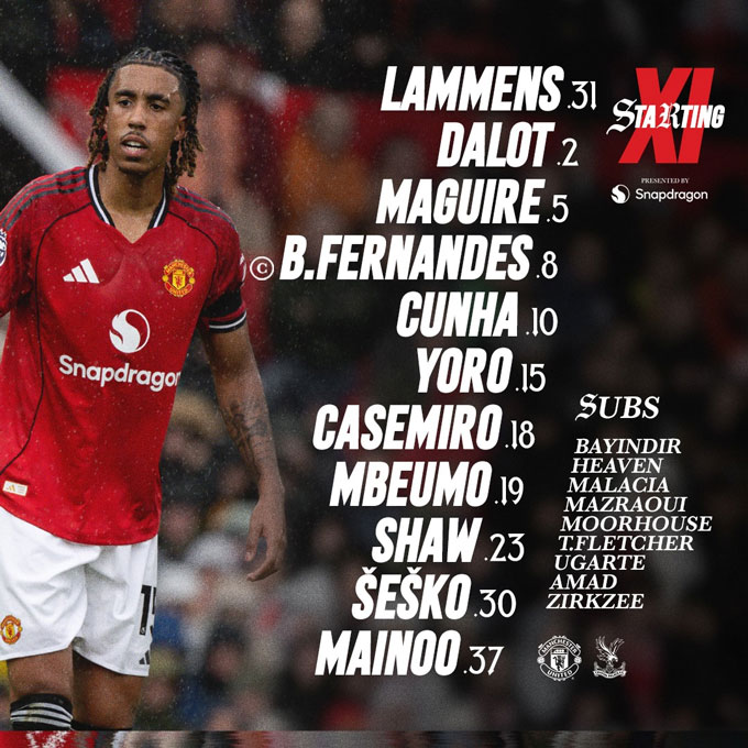 MU: Lammens, Dalot, Yoro, Maguire, Shaw, Casemiro, Mainoo, Mbeumo, Fernandes, Cunha, Sesko