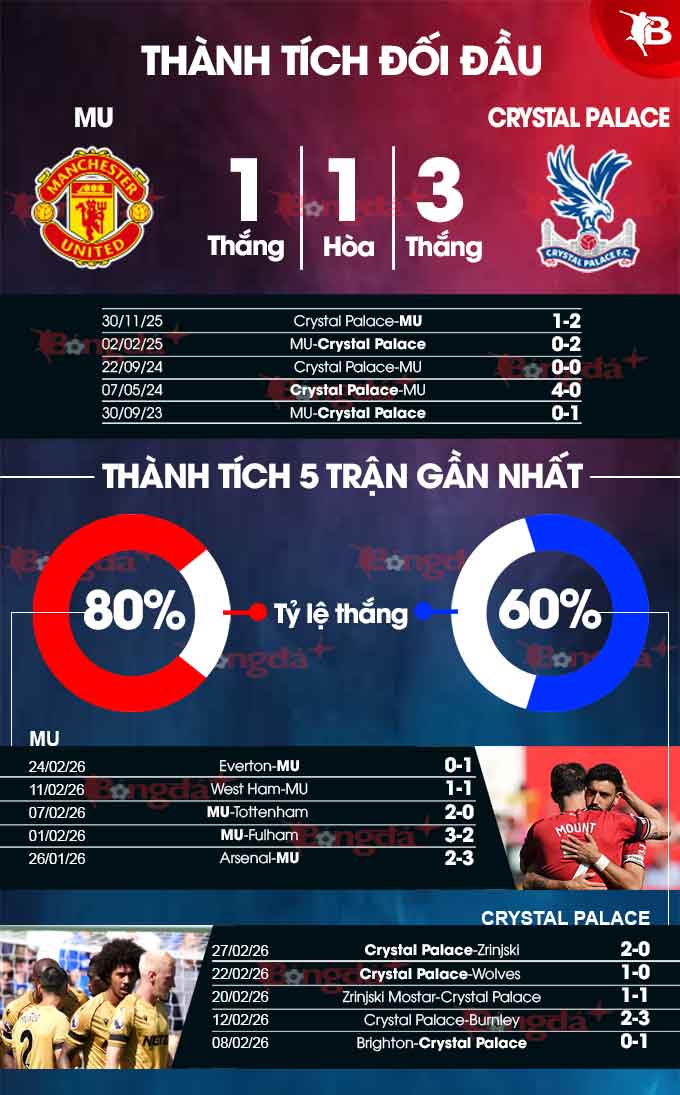 - Tối đa 2 bàn cả trận: 6/8 trận sân nhà gần đây của MU và 5/6 trận mới nhất của Crystal Palace chỉ có nhiều nhất 2 bàn thắng. 2 lần chạm trán vừa qua giữa hai đội ở Old Trafford xảy ra tình trạng tương tự.