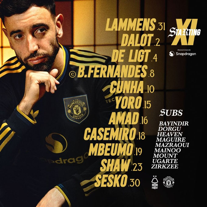 MU: Lammens, Shaw, De Ligt, Yoro, Amad, Casemiro, Fernandes, Dalot, Mbeumo, Cunha, Sesko