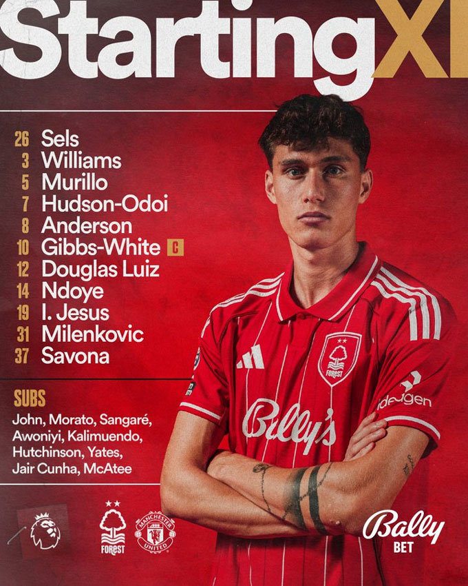 - Nottingham (4-2-3-1): Sels; Savona, Milenkovic, Murillo, Williams; Luiz, Anderson; Ndoye, Gibbs-White, Hudson-Odoi; Jesus.