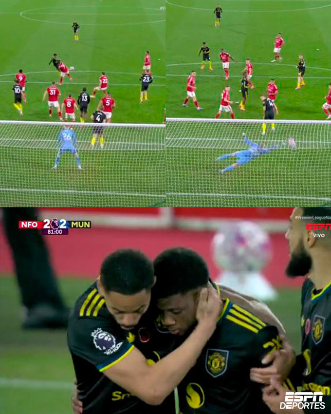 Amad Diallo nhận bóng trống trải bên cánh phải trước khi tung ra cú cứa lòng sở trường. Tuy nhiên, cú dứt điểm chưa đủ khó để đánh bại Matz Sels. Đây cũng là cú dứt điểm trúng đích đầu tiên của MU.