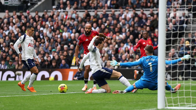 Không vào. Amad chuyền dài rất hay cho Fernandes xâm nhập vòng cấm Tottenham, đỡ ngực rồi dứt điểm nhưng bóng đi ra ngoài.