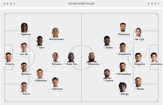 Làm khách trước Tottenham, MU như thường lệ ra sân với hệ thống 3-4-2-1. Đáng chú ý, Mbeumo là người được HLV Amorim bố trí lĩnh xướng hàng công thay cho Sesko ngồi dự bị. Hỗ trợ cho Mbeumo là bộ đôi Amad - Cunha.