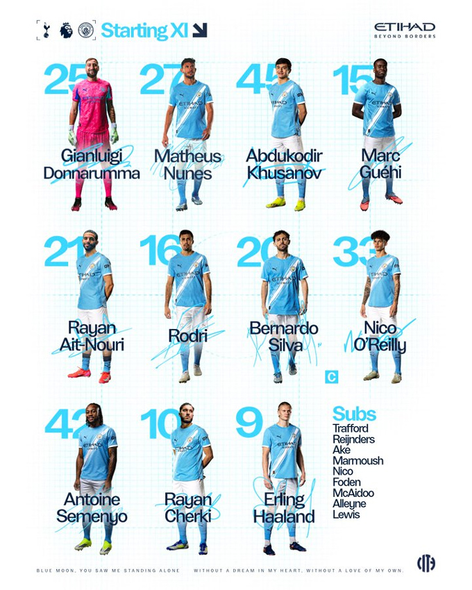 - Man City (4-1-4-1): Donnarumma; Nunes, Khusanov, Guehi, O'Reilly; Rodri; Cherki, Silva, Reijnders, Semenyo; Haaland