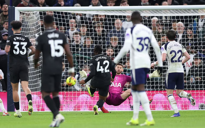 Lại từ một tình huống cướp bóng bên phần sân của Tottenham, Man City tổ chức phản công nhanh. Bernardo Silva chuyền bóng để Semenyo dễ dàng dứt điểm trong thế đối mặt với Vicario.