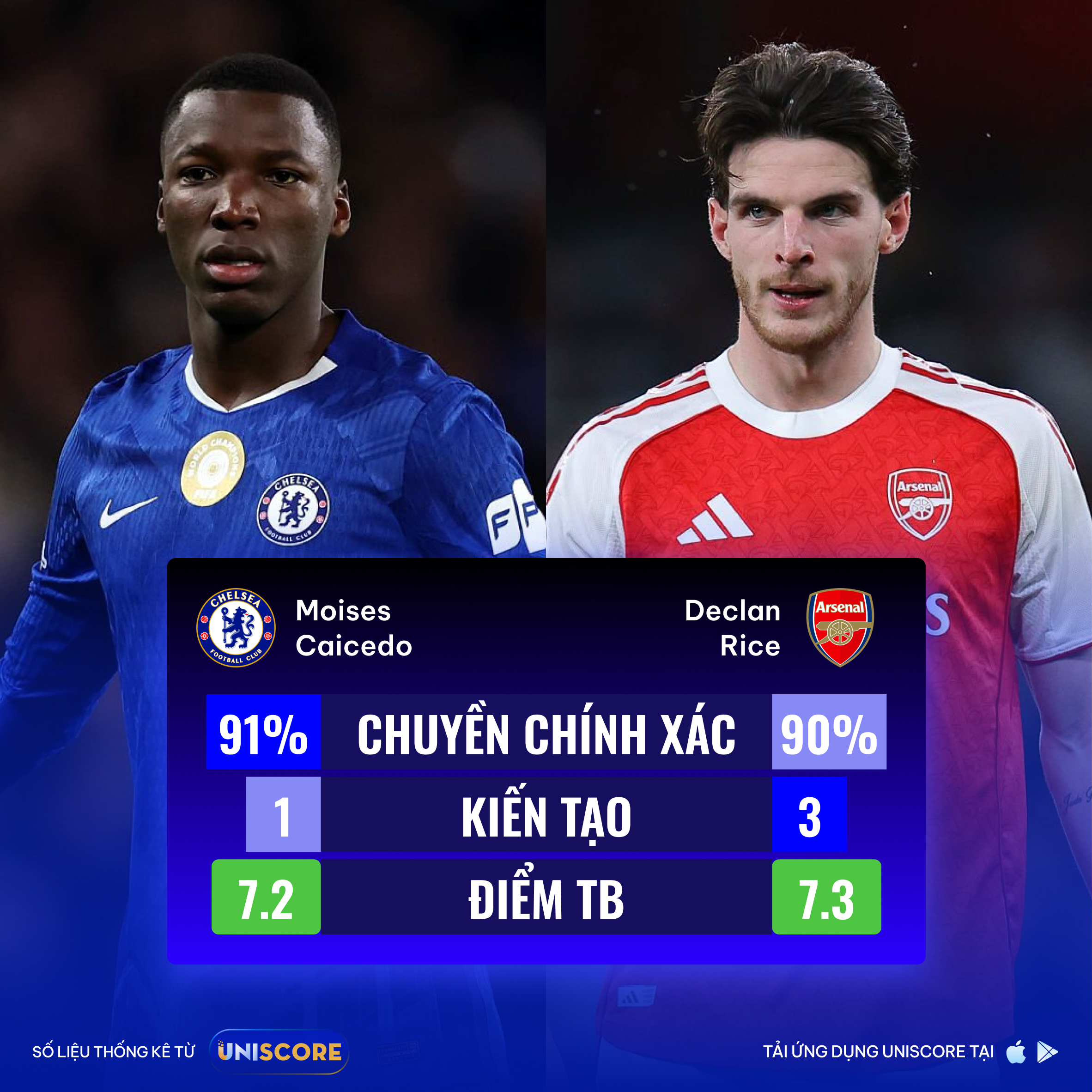 Tâm điểm sẽ là cuộc đấu ở tuyến giữa: Caicedo vs Declan Rice. Theo Uniscore, Caicedo chuyền bóng ấn tượng ngay cả khi bị áp sát (87%), giúp Chelsea thoát pressing. Rice lại toàn diện: đánh chặn tốt và dẫn đầu Arsenal về kiến tạo (3). Trên biên, Chelsea sở hữu Pedro Neto (3 bàn, 2 kiến tạo/5 trận gần nhất) và tài năng 18 tuổi Estevão (9 bàn/13 trận cho CLB và ĐTQG). Arsenal có Saka – nguồn sáng tạo chủ lực, và Trossard – cầu thủ mà mỗi lần ghi bàn, Arsenal chưa từng thua. Một khoảnh khắc từ Saka, Enzo Fernández hay một pha xử lý cá nhân hoàn hảo có thể quyết định trận đấu.