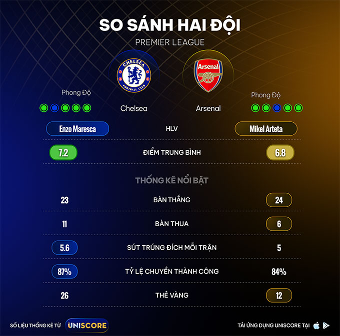 Chelsea có thành tích sân nhà ấn tượng, chỉ thua 2 trong 16 trận Premier League gần nhất. Ở các trận derby London tại Stamford Bridge, họ cũng thường chơi tốt với 8 chiến thắng và 3 trận hòa trong 12 trận gần đây. Tuy nhiên, Arsenal mới là đội chiếm ưu thế đối đầu. Chelsea đã không thắng Arsenal tại Stamford Bridge suốt 6 trận EPL liên tiếp (3 hòa, 3 thua) và chỉ có 1 chiến thắng trong 11 lần chạm trán gần nhất. Arteta cũng chưa từng thua tại đây kể từ khi dẫn dắt Arsenal. Arsenal đồng thời thể hiện phong độ sân khách xuất sắc, chỉ thua 1 trong 20 trận gần nhất, và hiếm khi sảy chân sau các trận đấu cúp châu Âu.