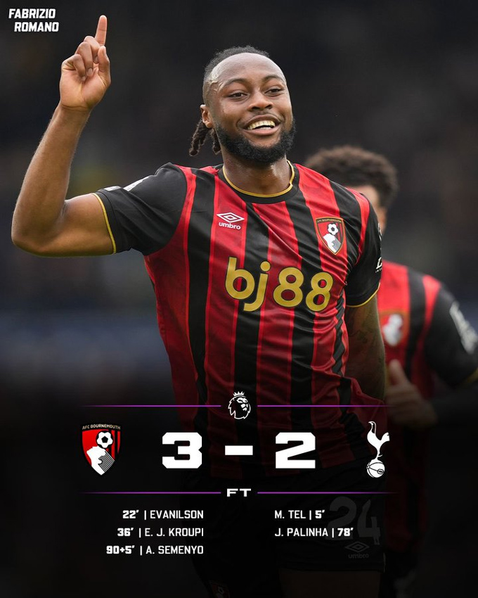 Kịch tính chưa dừng lại. Phút 90+5, Semenyo sắm vai người hùng của Bounemouth với bàn thắng ấn định tỷ số 3-2, khép lại "đại tiệc" mãn nhãn trên sân Vitality.