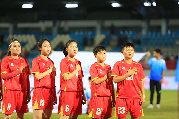 Các cầu thủ nữ Việt Nam khởi động trước trận. Ảnh: Đức Cường