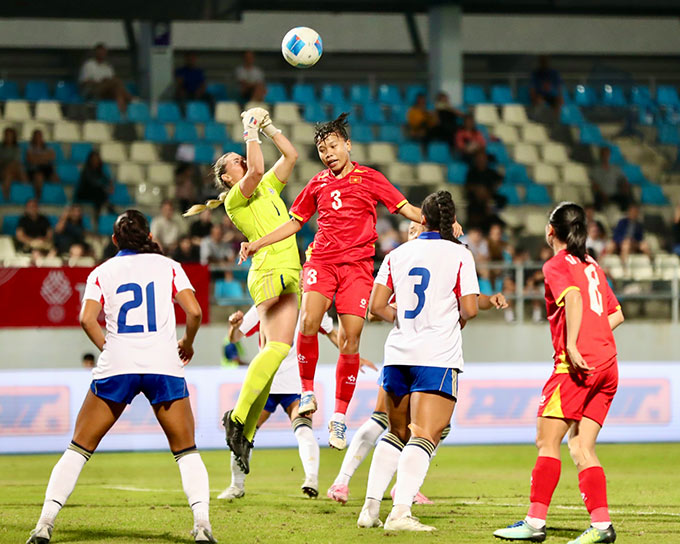 Cơ hội! Thủ môn Davies băng ra khỏi vòng cấm nhưng phối hợp không tốt với đồng đội. Hậu vệ Philippines đã phá bóng đúng tầm với của Bích Thuỳ trong vòng cấm địa. Tiền đạo cánh bên phía Việt Nam cứa lòng về góc xa nhưng thủ thành Philippines kịp lui về cản phá. Ảnh: Đức Cường