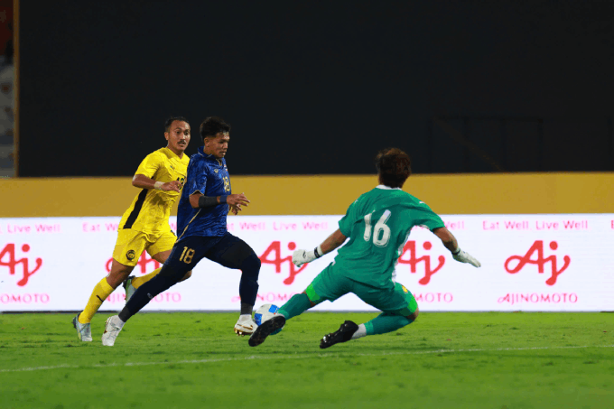 Không vào!!! Cú sút của Yotsakon đi sượt khung thành Malaysia trong gang tấc. Tiền đạo Thái Lan có pha xử lí bình tĩnh để vượt qua hậu vệ bên phía đội khách nhưng pha dứt điểm lại đi thiếu chính xác.