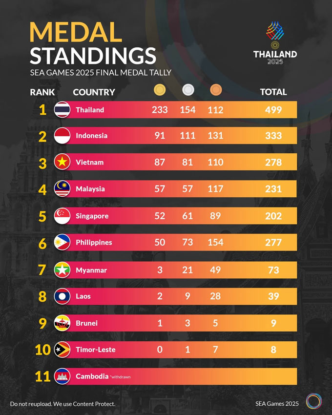 SEA Games 2025 được Thái Lan đăng cai trở lại sau 18 năm, và chúng ta phải dành lời khen ngợi cho màn trình diễn của tất cả các VĐV Thái Lan – những người đã đoàn kết, chung sức để giành lại danh hiệu Quốc gia dẫn đầu bảng tổng sắp huy chương.
