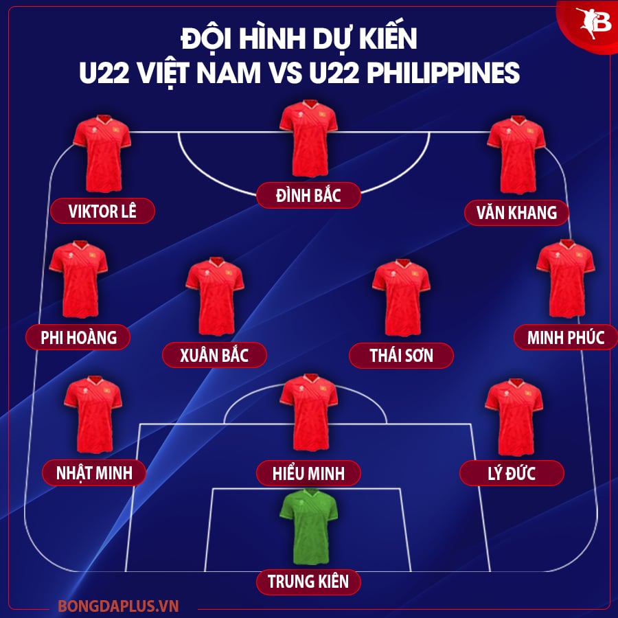 Trên hàng công, bộ ba Văn Khang, Đình Bắc và Viktor Lê gần như sẽ được giữ nguyên. Sự cơ động, khả năng quấy phá của 3 cầu thủ này được kỳ vọng sẽ tạo ra những sức ép lớn lên khung thành của Philippines. Bên cạnh đội hình 11 cầu thủ đá chính, U22 Việt Nam vẫn còn rất nhiều nhân tố “bí ẩn” có thể được tung vào sân để định đoạt trận đấu như Lê Phát, Văn Thuận, Ngọc Mỹ, Công Phương, Thanh Nhàn và Quốc Việt.