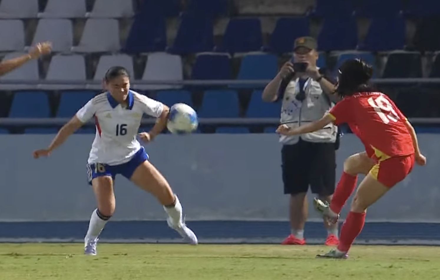 Hậu vệ Sofia Nicole để bóng chạm tay trong vòng cấm địa sau đường chuyền từ cánh phải của Thanh Nhã bên phía ĐT nữ Việt Nam. Nhưng trọng tài Gulshoda không thổi phạt đền cho Việt Nam.