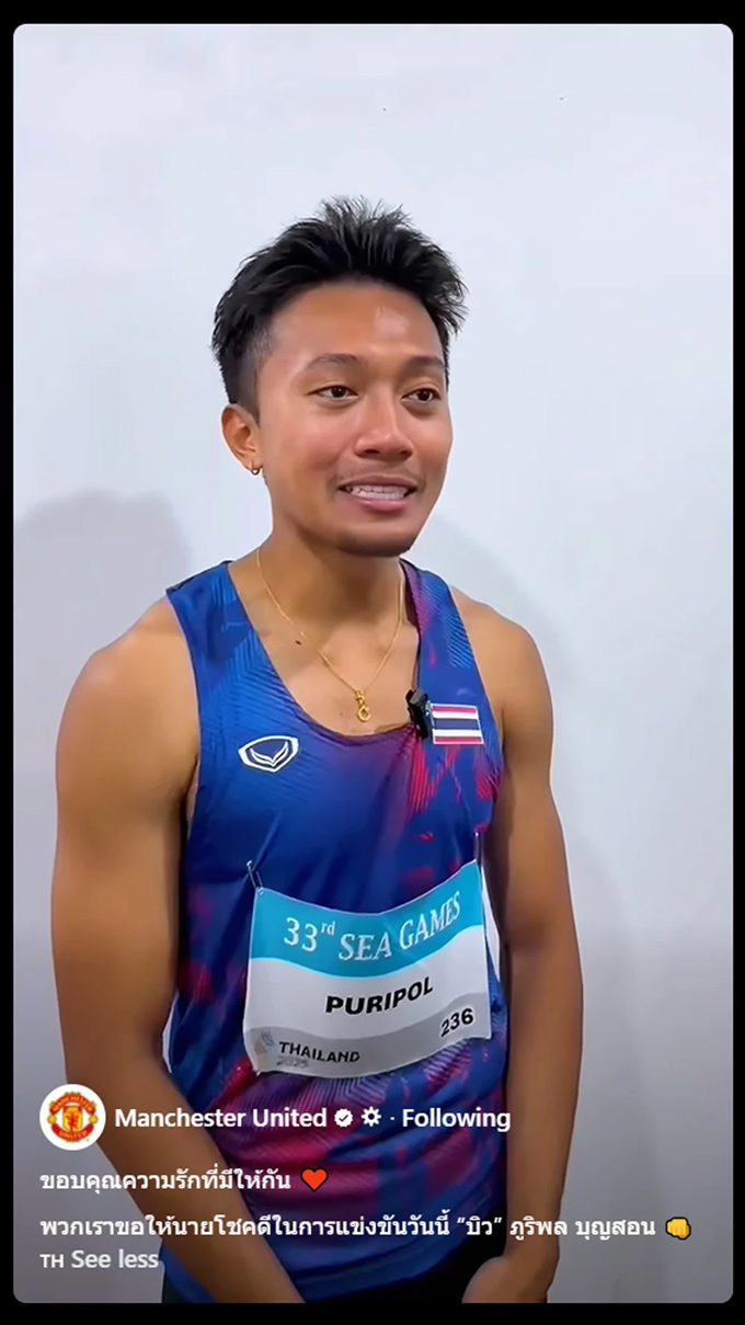 Puripol Boonsorn, thường được gọi thân mật là “Thep Bew”, vốn là một fan của Manchester United. Chính vì vậy, việc được CLB giàu truyền thống bậc nhất nước Anh gửi lời chúc công khai trước thềm SEA Games đã khiến VĐV sinh năm 2006 vô cùng xúc động.