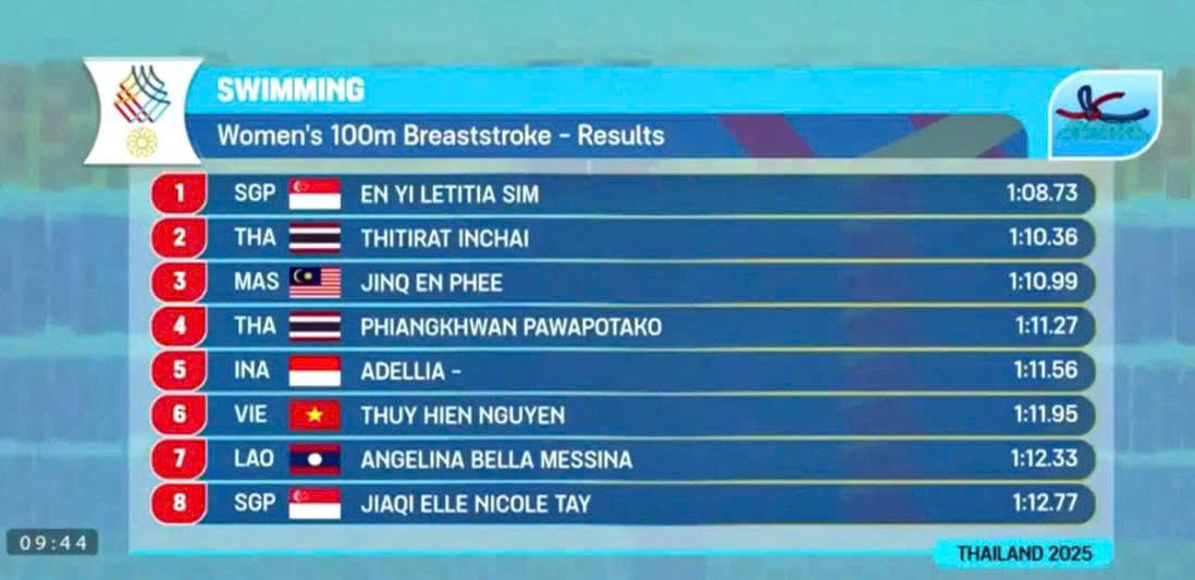 Kình ngư 17 tuổi Nguyễn Thúy Hiền giành được HCĐ ở chung kết 100m bơi ếch với thành tích 1 phút 10 giây 40. VĐV Letitia Sim (Singapore) giành HCV với thành tích 1 phút 06 giây 79, HCB thuộc về En Phee (Malaysia) với thành tích 1 phút 10 giây 09.