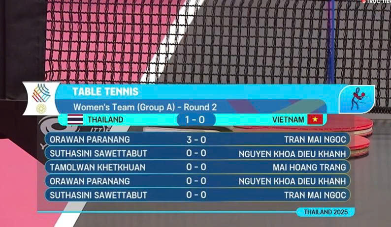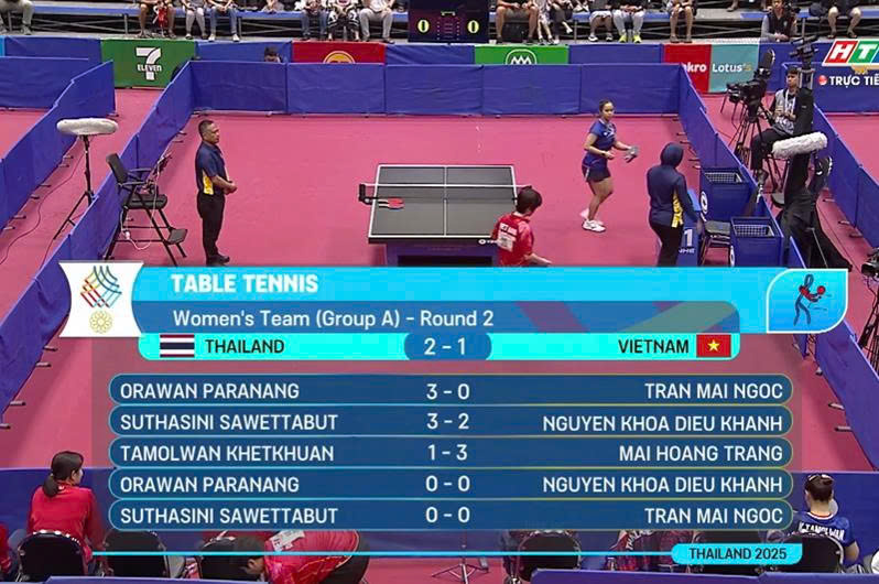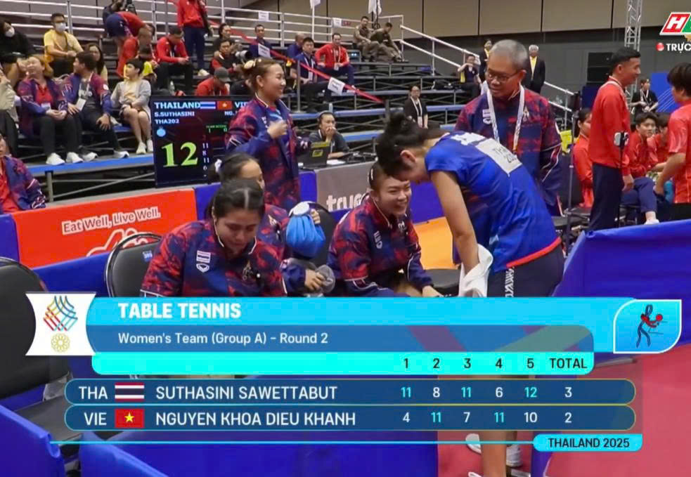 Nguyễn Khoa Diệu Khánh để thua 3-0 trước Thái Lan, ba cô gái bóng bàn Việt Namd thua1-3 chung cuộc ở nội dung đồng đội nữ.