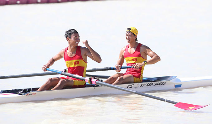 Huy chương vàng thứ 51 cho thể thao Việt Nam. Bộ đôi Hoàng Văn Đạt và Nguyễn Phú đã cán đích đầu tiên ở nội dung thuyền đôi nam hạng nhẹ. Ảnh: Bùi Lượng
