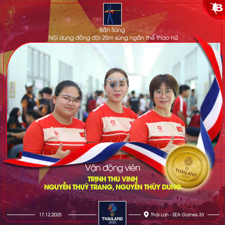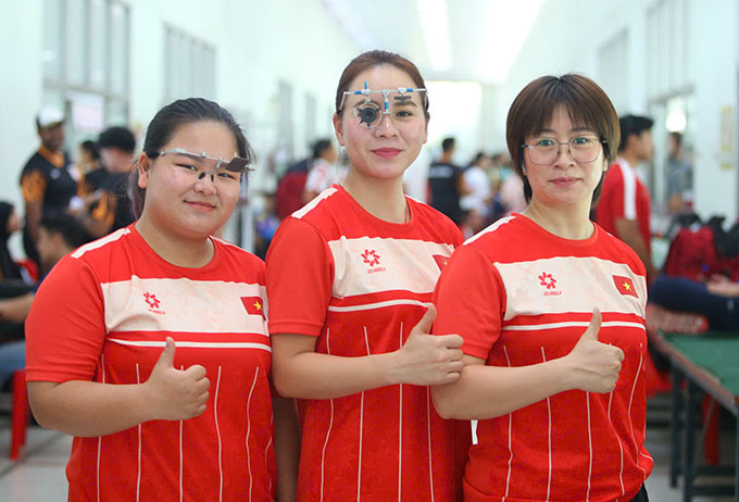 Việt Nam giành HCV 25m súng ngắn đồng đội nữ Với tổng điểm 1746-63x, các xạ thủ Nguyễn Thùy Dung, Nguyễn Thùy Trang, Trịnh Thu Vinh xếp nhất, giành HC vàng. HC bạc và đồng thuộc về các đội Indonesia và Thái Lan. Ảnh: Đức Cường